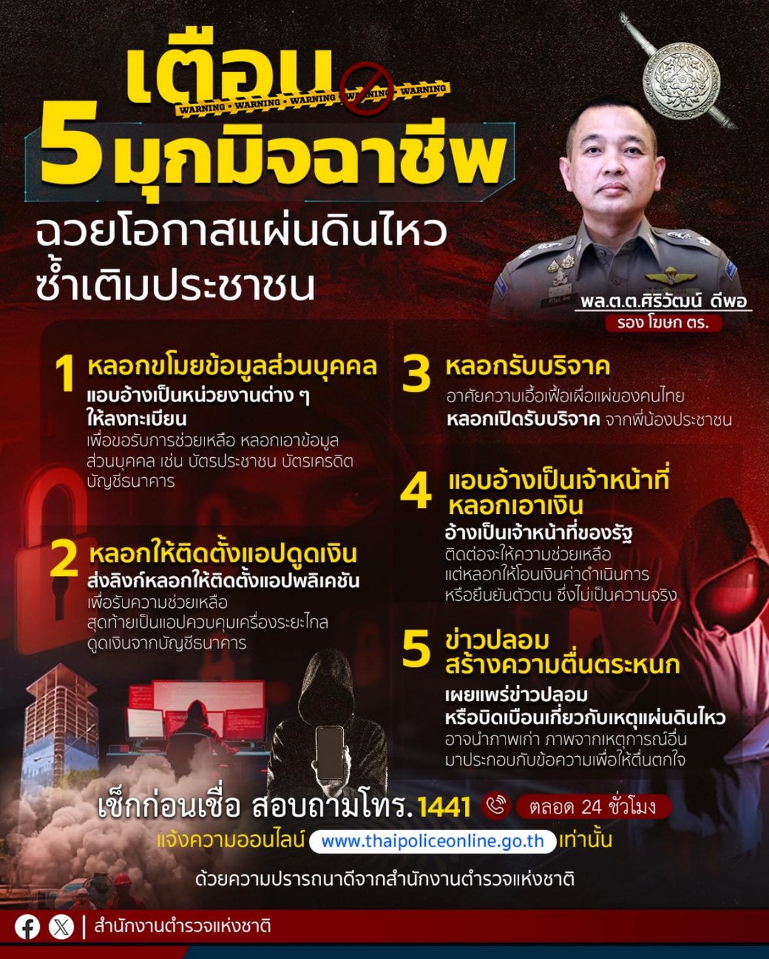 สำนักงานตำรวจแห่งชาติ เตือน 5 มุกมิจฯ ฉวยโอกาสแผ่นดินไหว ซ้ำเติมประชาชน.พล.ต.ต.ศิริวัฒน์ ดีพอ รองโฆษ…