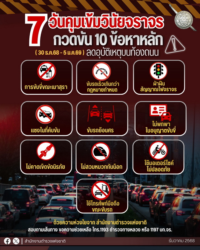 7 วันคุมเข้ม ลดอุบัติเหตุ “ปีใหม่ 2569”ตำรวจกวดขันวินัยจราจร 10 ข้อหาหลัก เพื่อลดอุบัติเหตุบนท้องถนน…