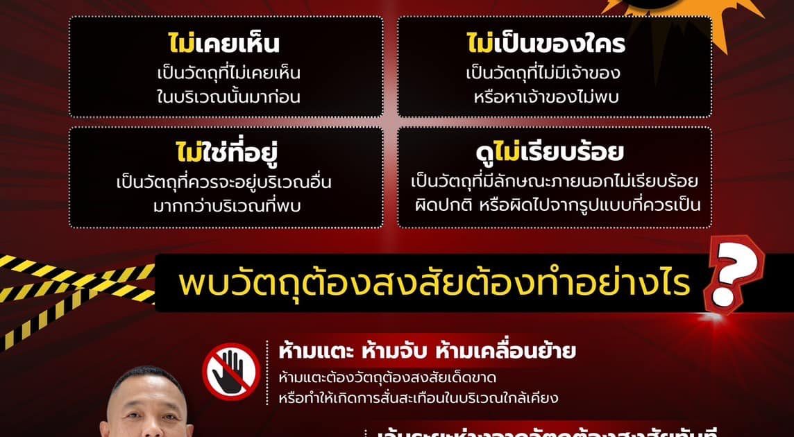 ทั้งนี้ แม้ว่าเหตุระเบิดในประเทศไทยจะเกิดขึ้นไม่บ่อยนัก แต่เหตุระเบิดสามารถก่อให้เกิดความสูญเสียต่อชีวิตและทรัพย์สินได้อย่างร้ายแรง พี่น้องประชาชนจึงควรศึกษาและปฏิบัติตามแนวทางเมื่อพบวัตถุต้องสงสัย เพื่อเสริมสร้างสังคมที่ปลอดภัยและลดความเสี่ยงในการเกิดความสูญเสีย