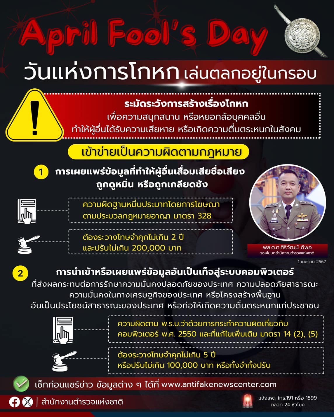วันนี้ (1 เมษายน 2567) พล.ต.ต.ศิริวัฒน์ ดีพอ รองโฆษกสำนักงานตำรวจแห่งชาติ กล่าวว่า พล.ต.อ.กิตติ์รัฐ พันธุ์เพ็ชร์ รอง ผบ.ตร. รักษาราชการแทน ผบ.ตร. ได้มีความห่วงใยพี่น้องประชาชนที่อาจได้รับความเสียหายจากอาชญากรรมรูปแบบต่าง ๆ และด้วยวันที่ 1 เม.ย.นี้ ตรงกับวัน April Fool’s Day หรือ วันแห่งการโกหก ซึ่งมักจะมีการสร้างเรื่องโกหกเพื่อความสนุกสนาน หรือเพื่อหยอกล้อซึ่งกันและกันในหมู่เพื่อนฝูง โดยหลาย ๆ คน มักจะใช้เป็นกิจกรรมที่สร้างความสัมพันธ์และคลายความเครียด แต่บางครั้งการล้อเล่นหรือการโกหก ก็อาจส่งผลกระทบต่อผู้อื่นหรืออาจสร้างความตื่นตระหนกในสังคมได้เช่นเดียวกัน โดยเฉพาะการโพสต์เรื่องโกหกผ่านสื่อสังคมออนไลน์ ซึ่งอาจมีการเผยแพร่ ส่งต่อ หรือแชร์ ทำให้เรื่องโกหกกระจายไปในวงกว้าง