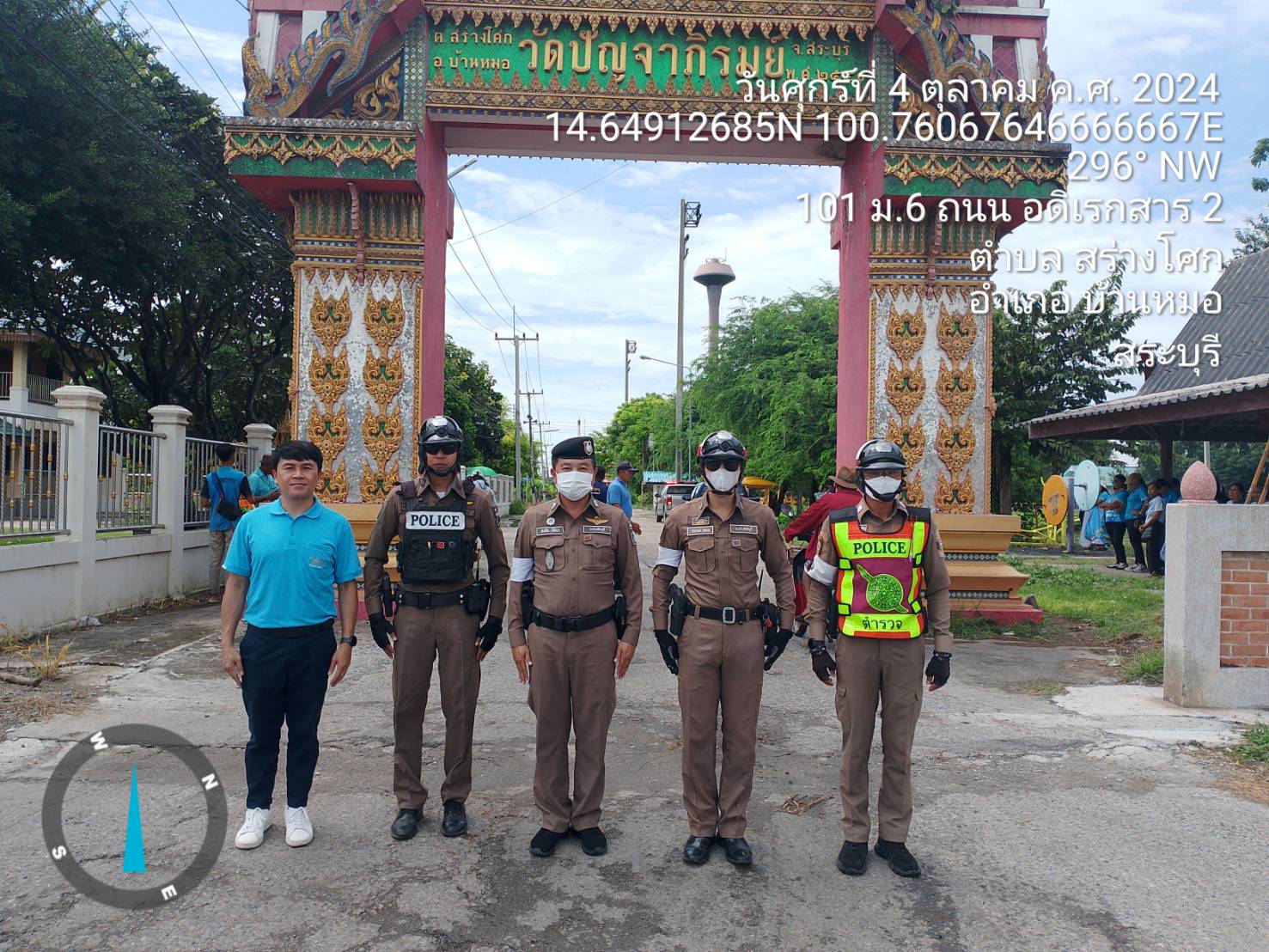 วันที่ 4 ตุลาคม 2567 เวลา 09.00 น. ภายใต้การอำนวยการของ พ.ต.อ.มนัสเวท ทองอิ่ม ผกก.สภ.บ้านหมอ, พ.ต.ท.พล พื้นพรม รอง ผกก.ป.สภ.บ้านหมอ, พ.ต.ท.สราวุธ โกษีโรจน์ สวป.สภ.บ้านหมอ ได้สั่งการให้ ร.ต.อ.โอภาส วงษ์ชื่น รอง สว.(ป.) สภ.บ้านหมอ ร้อยเวร 20 พร้อมด้วย จ.ส.ต.ปรัชญา บุญยรัตน์ ผบ.หมู่(ป.) สภ.บ้านหมอ ร่วมงานพิธีแห่รับเงินพระราชทานขวัญถุงกองทุนแม่ของแผ่นดินประจำปี 2567 บ้านปัญจาภิรมย์ หมู่ที่ 6 ต.สร่างโศก อ.บ้านหมอ จ.สระบุรี ณ วัดปัญจาภิรมย์ เหตุการณ์ทั่วไปปกติ