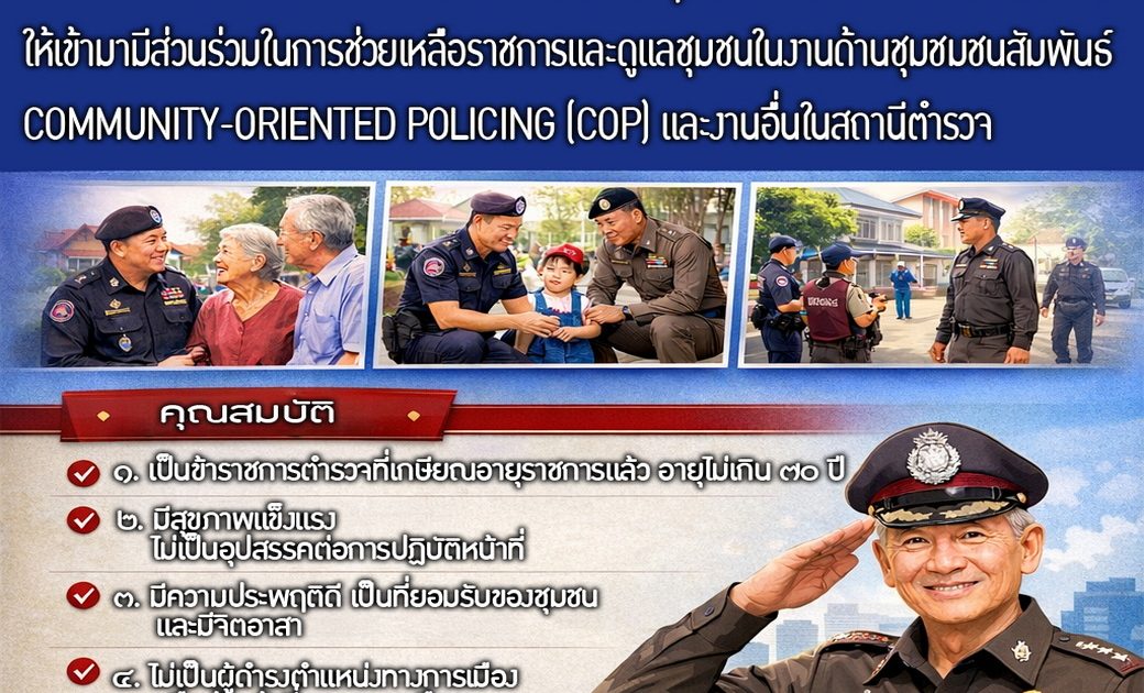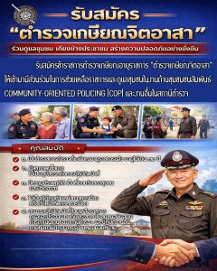 รับสมัครข้าราชการตำรวจเกษียณอายุราชการ “ตำรวจเกษียณจิตอาสา” ให้เข้ามามีส่วนร่วมร่วมในการช่วยเหลือราชการและดูแลชุมชนในงานด้านชุมชมชนสัมพันธ์ Community-Oriented Policing (COP) และงานอื่นในสถานีตำรวจ โดยเข้าไปเป็นส่วนหนึ่งของโครงการอาสาสมัครตำรวจบ้าน ที่รับการจัดสรรงบประมาณแล้ว