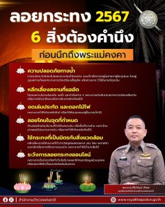 ดังนั้น เพื่อให้เทศกาลลอยกระทงเป็นไปอย่างปลอดภัย สนุกสนาน และไม่ทำลายสิ่งแวดล้อม สำนักงานตำรวจแห่งชาติจึงขอแนะนำ 6 สิ่งที่ต้องคำนึง ในช่วงเทศกาลลอยกระทง ดังนี้